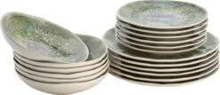 Geschikt voor 6 personen. Een complete serviesset inclusief dinerborden, diepe borden, soepkommen, gebaksborden en een saladeschaal. Alle borden en schalen zijn gemaakt van hoogwaardig beenderporselein, beter bekend als New Fine Bone Porselein. Dit is een luxe porseleinsoort van hoge kwaliteit, gemaakt volgens een speciaal procedé.